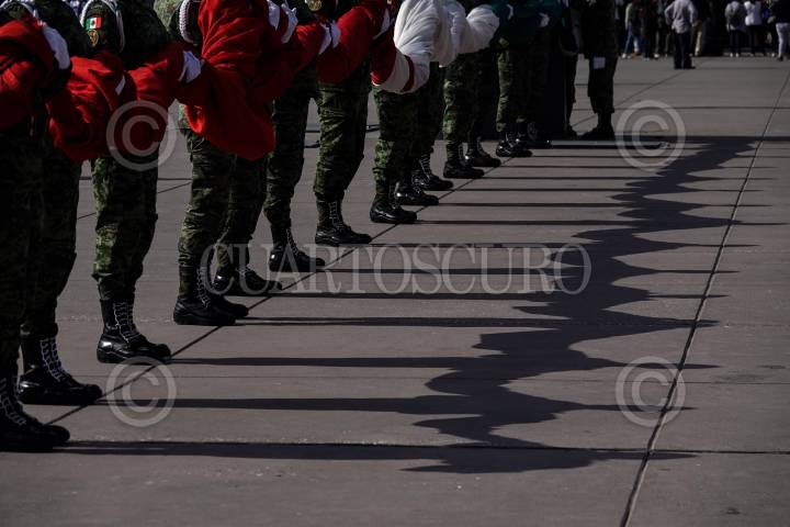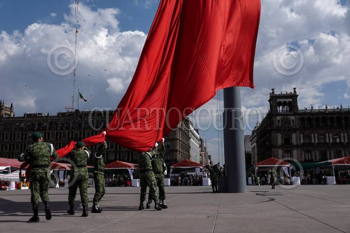 Elementos de la SEDENA realizan el arriamiento de la bandera del Zócalo capitalino.