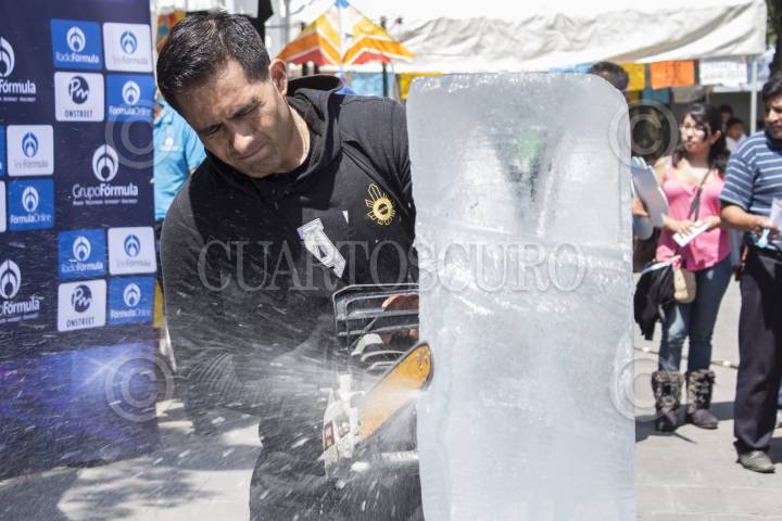 MEXICO, D.F., 12JULIO2014.- Hoy inició la edición 157 de la Feria de las Flores en el Parque de la Bombilla, de la delegación Álvaro Obregón. A la feria acuden productores de plantas y flores de la Delegación Xochimilco, Milpa Alta y otras delegaciones del Distrito Federal. En la imagen, un hombre realiza una escultura de hielo en dicha feria. FOTO: DAVID POLO /CUARTOSCURO.COM