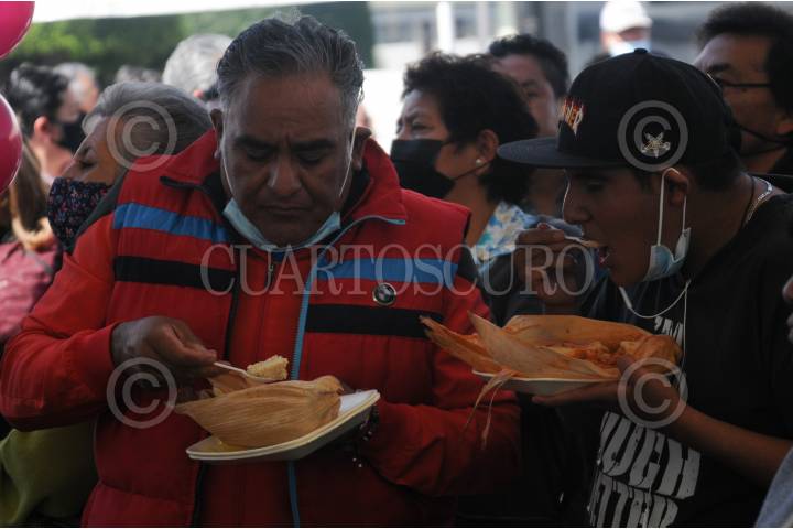 Habitantes de la Alcaldía Venustiano Carranza degustan algunos de los tamales que se venden en la Feria.