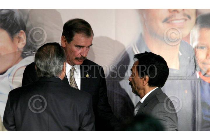 MEXICO, D.F., 20ABRIL2006.- Vicente Fox, presidente de la República y Víctor Flores, líder ferrocarrilero, durante la ceremonia de la XC Sesión Ordinaria de la Honorable Asamblea General del INFONAVIT, en su sede nacional. FOTO: Moisés Pablo/CUARTOSCURO.COM