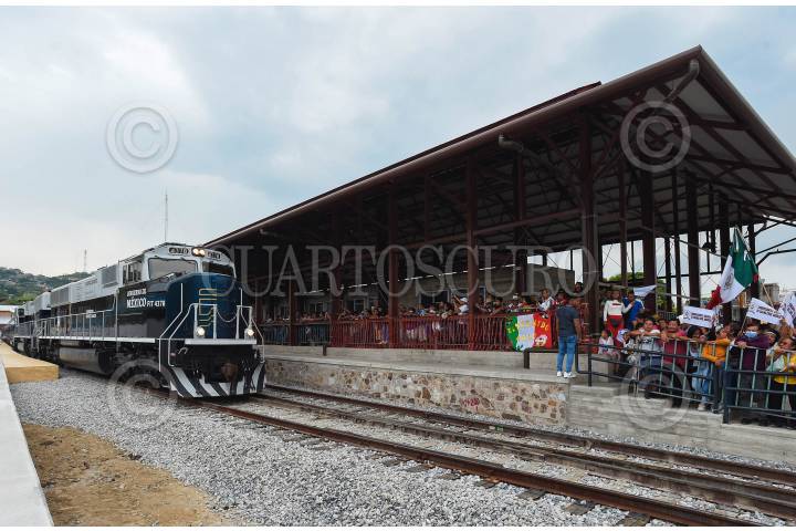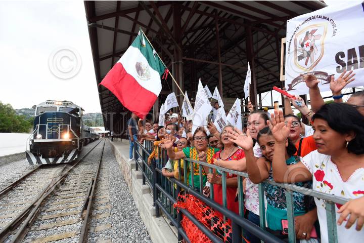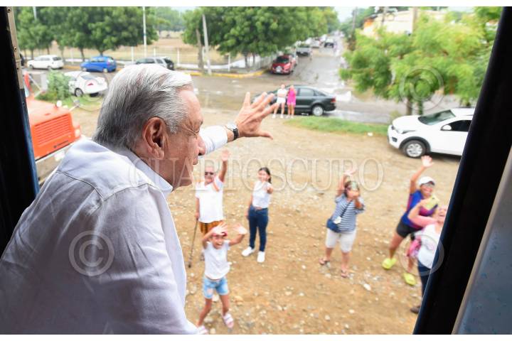 SALINA CRUZ, OAXACA, 17SEPTIEMBRE2023.- Andrés Manuel López Obrador, Presidente de México, viajo en el Ferrocarril del Istmo de Tehuantepec de Salina Cruz a Coatzacoalcos, durante el recorrido fue saludando a la gente de los poblados que están junto a las vías. FOTO: PRESIDENCIA/CUARTOSCURO.COM