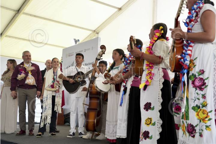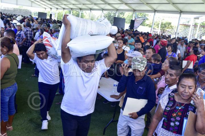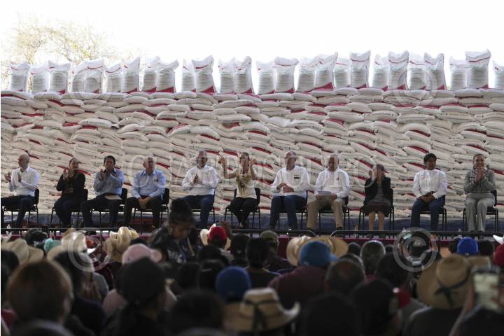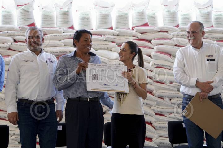 SALVADOR ESCALANTE, MICHOACÁN, 08FEBRERO2025.- Claudia Sheinbaum, presidenta de México, encabezó la entrega de fertilizantes a agricultores de la comunidad de Salvador Escalante, Michoacán, a fin de fortalecer los apoyos al campo. FOTO: PRESIDENCIA/CUARTOSCURO.COM