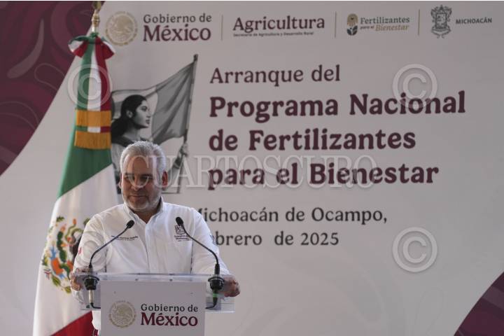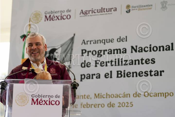 CUITZEO, MICHOACÁN, 07FEBRERO2025.- Alfredo Ramírez Bedolla, gobernador de Michoacán, durante el arranque del Programa Nacional de Fertilizantes para el Bienestar en la entidad para el apoyo a las y los agricultores michoacanos. FOTO: PRESIDENCIA/CUARTOSCURO.COM