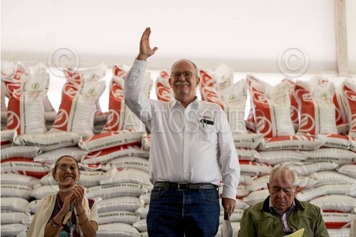 SALVADOR ESCALANTE, MICHOACÁN, 08FEBRERO2025.- Julio Berdegué Sacristán, secretario de Agricultura y Desarrollo Rural, durante la entrega de fertilizantes a agricultores de la comunidad de Salvador Escalante, Michoacán, a fin de fortalecer los apoyos al campo. FOTO: PRESIDENCIA/CUARTOSCURO.COM