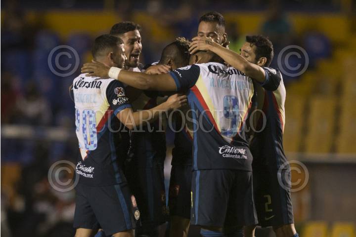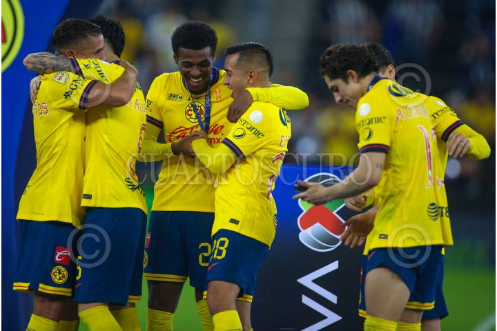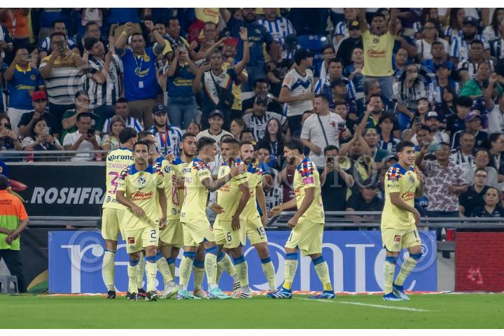 GUADALUPE, NUEVO LEÓN, 28CTUBRE2023.- Jugadores del América, festejan el gol ante los Rayados del Monterrey, en el estadio BBVA, partido correspondiente a la jornada 14 de la Apertura 2023. Marcador Final: Monterrey: 0 - América 3. FOTO: CUARTOSCURO.COM