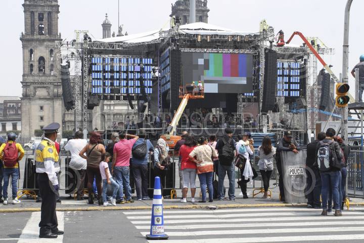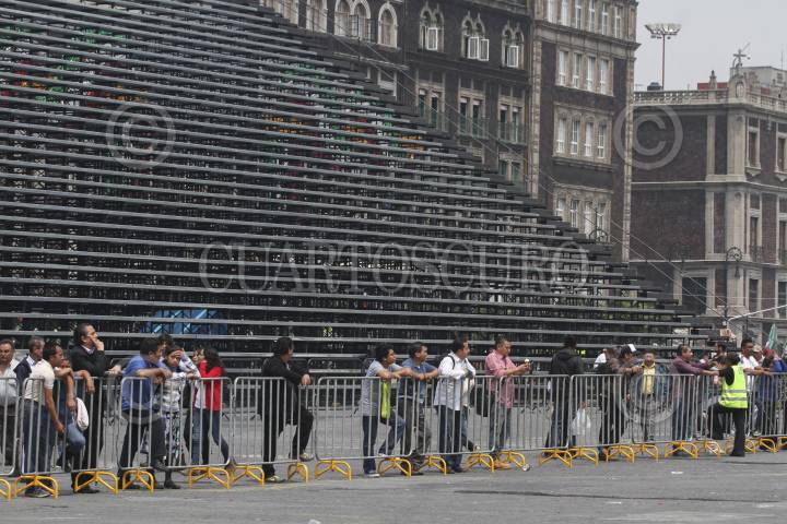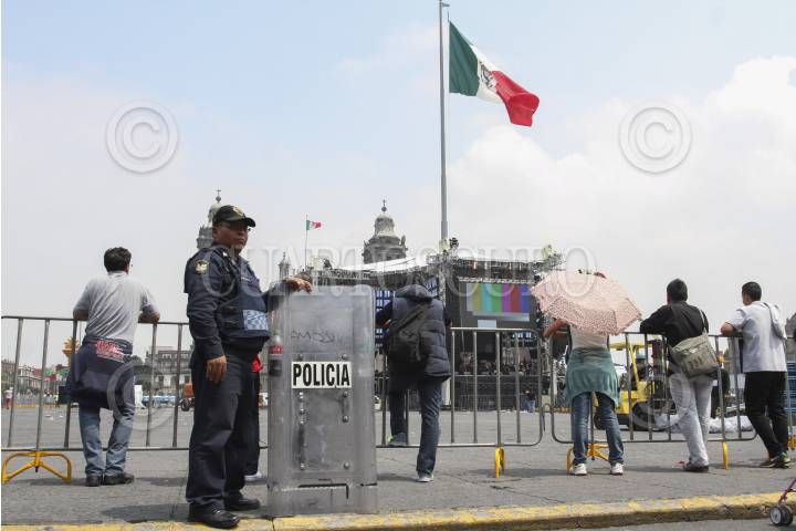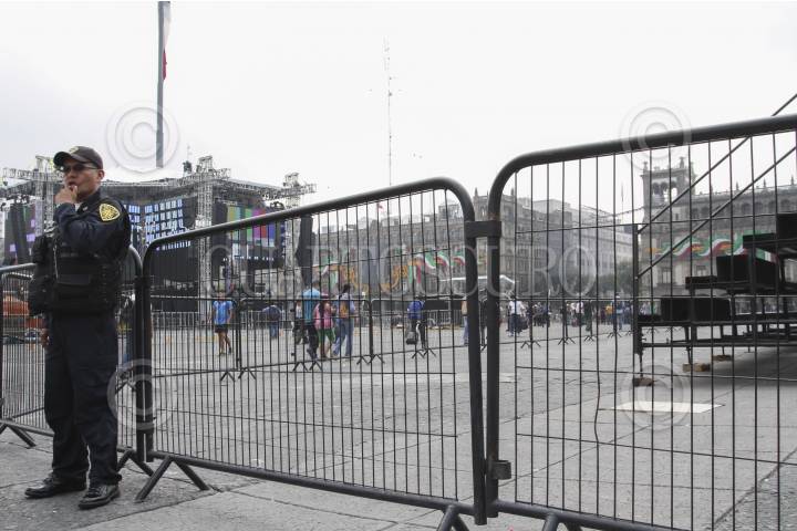 MÉXICO, D.F., 14SEPTIEMBRE2015.- Personal de seguridad capitalina resguarda el perímetro del Zócalo, Mañana acontecerá el espectáculo por los festejos patrios en el primer cuadro de la ciudad, en donde se llevará a cabo el Grito de Independencia y una serie de conciertos para conmemorar este feriado nacional. FOTO: MARÍA JOSÉ MARTÍNEZ /CUARTOSCURO.COM