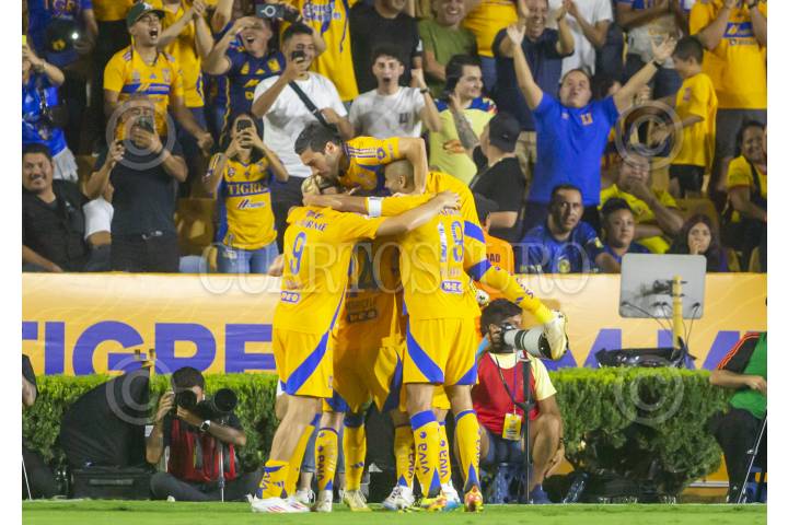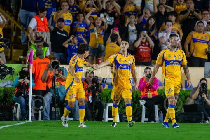 SAN NICOLÁS DE LOS GARZA, NUEVO LEÓN, 17JULIO2024.- Jugadores de Tigres, festejan el gol, ante el América, en el estadio Universitario, partido correspondiente a la jornada 3 de la Apertura 2024 de la Liga Mx. Marcador Final: Tigres: 1 - América: 0. FOTO: GABRIELA PÉREZ MONTIEL / CUARTOSCURO.COM