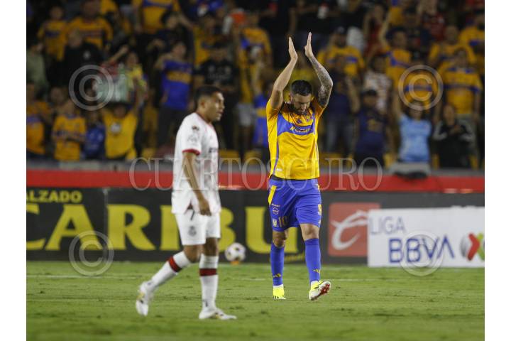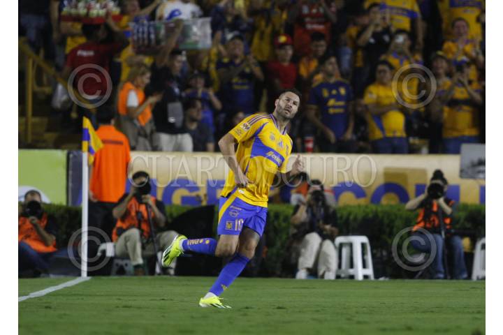 SAN NICOLÁS DE LOS GARZA, NUEVO LEÓN, 06JULIO2024.- André-Pierre Gignac de Tigres, festeja el gol ante el Necaxa, en el estadio Universitario, partido correspondiente a la jornada 1 de la Apertura 2024 de la Liga MX. Marcador Final: Tigres: 1 - Necaxa: 0. FOTO: CUARTOSCURO.COM