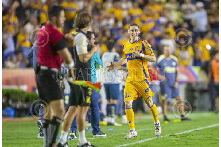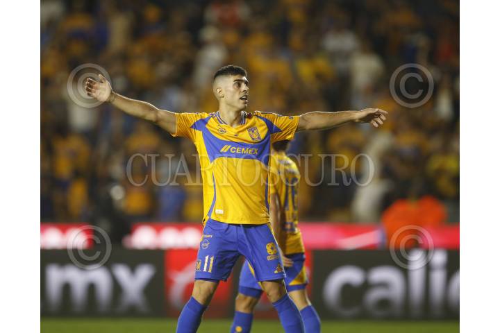 SAN NICOLÁS DE LOS GARZA, NUEVO LEÓN, 13SEPTIEMBRE2024.- Fernando Gorriarán de Tigres, festeja el gol, ante el Atlético de San Luis, en el estadio Universitario, partido correspondiente a la jornada 7, de la Apertura 2024. Marcador Final: Tigres: 1 - Atlético San Luis: 0. FOTO: GABRIELA PÉREZ MONTIEL / CUARTOSCURO.COM