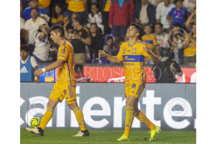 SAN NICOLÁS DE LOS GARZA, NUEVO LEÓN, 08AGOSTO2025.- Edgar López de los Tigres de la UANL, festeja el gol, ante el Puebla, en el estadio Universitario, partido correspondiente a la jornada 4 de la Apertura 2025. Marcador Final: Tigres: 7 - Puebla: 0. FOTO: GABRIELA PÉREZ MONTIEL / CUARTOSCURO.COM