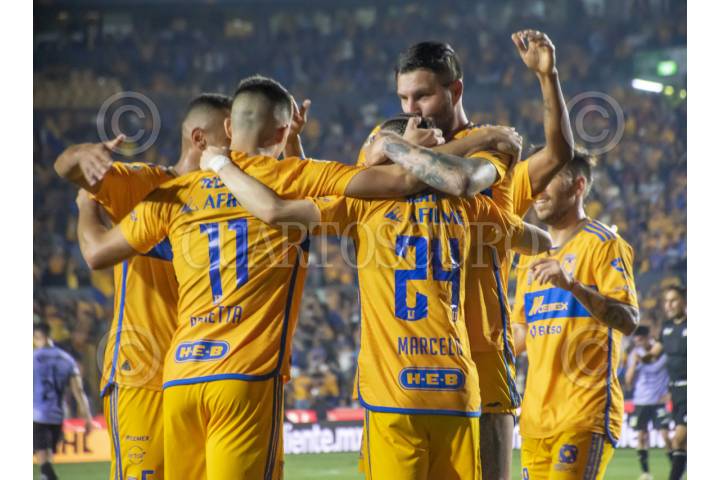 SAN NICOLÁS DE LOS GARZA, NUEVO LEÓN, 16MARZO2024.- Jugadores de Tigres festejan el triunfo ante Mazatlán FC, en el estadio Universitario, partido correspondiente a la jornada 12 de la Clausura 2024. Marcador Final: Tigres: 5 - Mazatlán FC: 1. FOTO: GABRIELA PÉREZ MONTIEL / CUARTOSCURO.COM