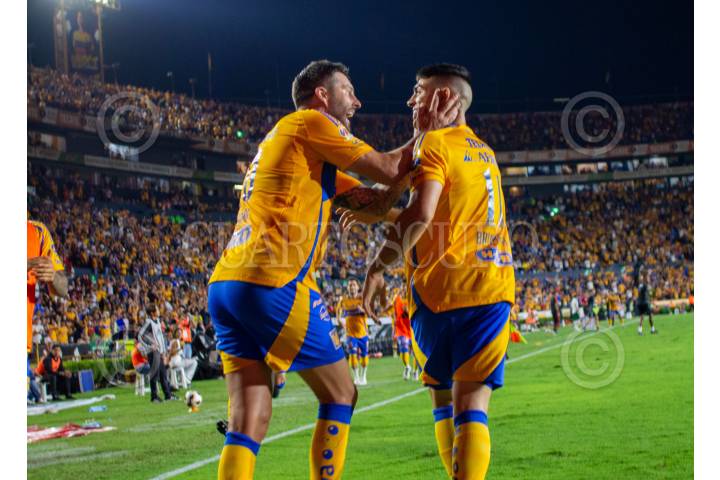 SAN NICOLÁS DE LOS GARZA, NUEVO LEÓN, 27SEPTIEMBRE2024.- André-Pierre Gignac y Juan Bruneta de los Tigres, festejan el gol, ante el equipo de León, en el estadio Universitario, partido correspondiente a la jornada 10 de la Apertura 2024 de la Liga MX. Marcador Final: Tigres: 2 - León: 2. FOTO: GABRIELA PÉREZ MONTIEL / CUARTOSCURO.COM