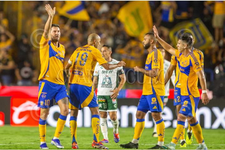 SAN NICOLÁS DE LOS GARZA, NUEVO LEÓN, 27SEPTIEMBRE2024.- Jugadores de los Tigres, festejan el gol, ante el equipo de León, en el estadio Universitario, partido correspondiente a la jornada 10 de la Apertura 2024 de la Liga MX. Marcador Final: Tigres: 2 - León: 2. FOTO: GABRIELA PÉREZ MONTIEL / CUARTOSCURO.COM
