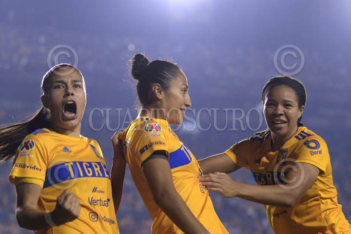 Jacqueline Ovalle, Stephany Mayor y Mia Renee de Tigres Femenil festejan el gol ante Rayadas, en el estadio Universitario, partido correspondiente a la ida en Semifinales