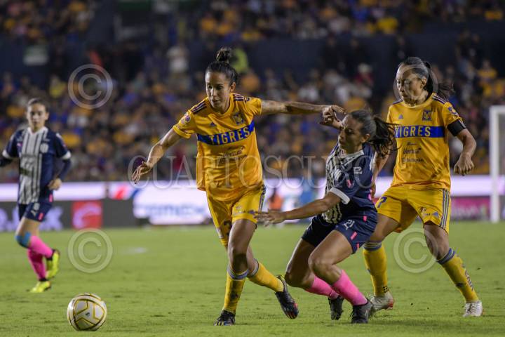 Bianca Sierra de Tigres Femenil se disputa el balón con Barbara Oliveril de Rayadas, en el estadio Universitario, partido correspondiente a la ida en Semifinales