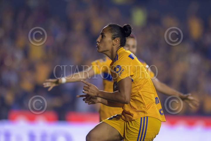 Stephany Mayor de Tigres Femenil festeja el gol ante Rayadas, en el estadio Universitario, partido correspondiente a la ida en Semifinales