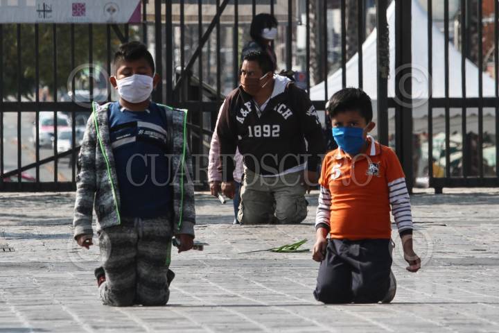 Niños y su padre entran de rodillas a la Basílica de Guadalupe. FOTO: ROGELIO MORALES /CUARTOSCURO.COM
