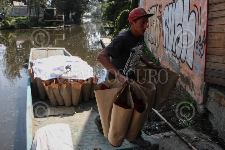 Un hombre descarga de una trajinera decenas de nochebuenas en Xochimilco. FOTO: ROGELIO MORALES /CUARTOSCURO.COM