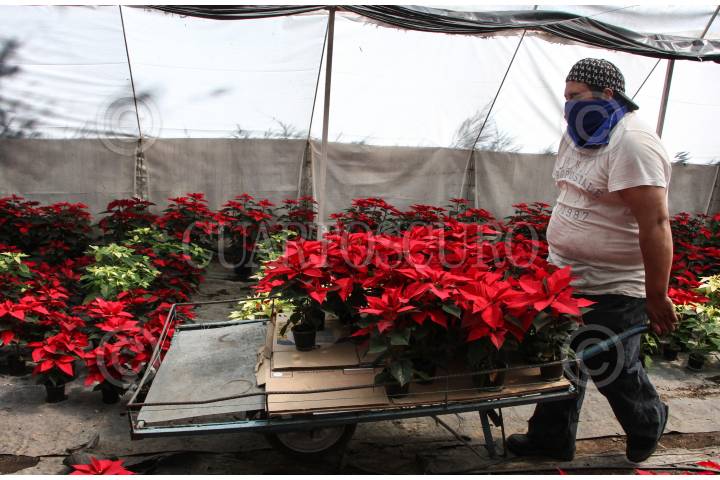Trabajador de invernadero transporta en carretilla, macetas de nochebuena. FOTO: ROGELIO MORALES /CUARTOSCURO.COM