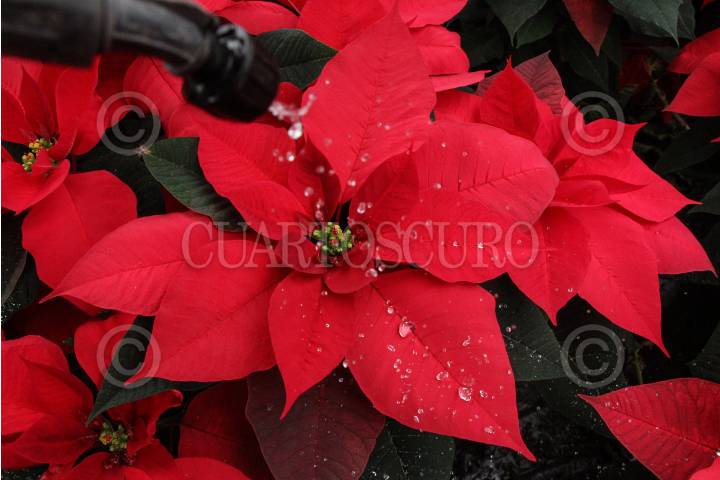 Riego cotidiana de la flor de nochebuena en los invernaderos de Xochimilco. FOTO: ROGELIO MORALES /CUARTOSCURO.COM
