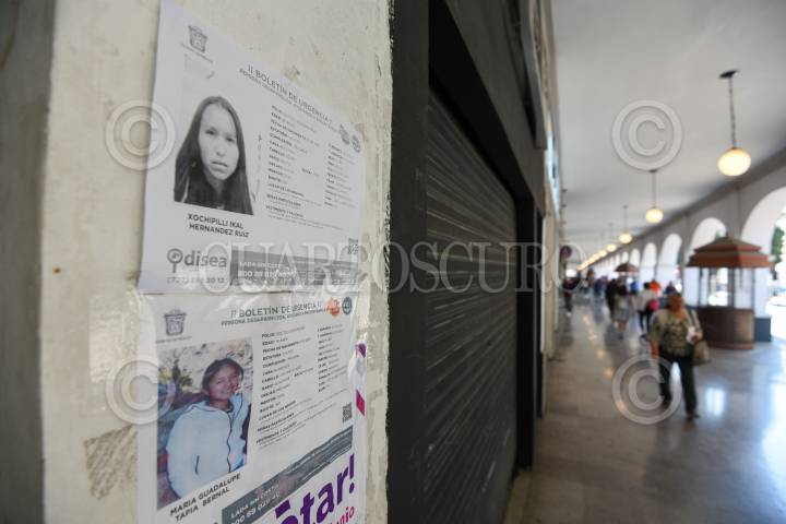 Fichas de búsqueda de jóvenes desaparecidas pegadas en paredes de los Portales de Toluca.