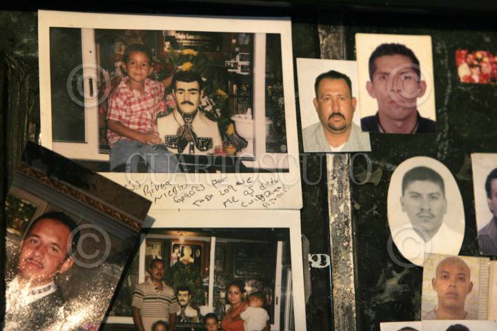 CULIACÁN, SINALOA, 05MAYO2009.- Seguidores de Jesús Malverde dejan sus fotografías en la capilla para encomendarse a la imágen del bandido sinaloense que robaba a los ricos para darselo a los pobres. FOTO: IVAN STEPHENS/CUARTOSCURO.COM