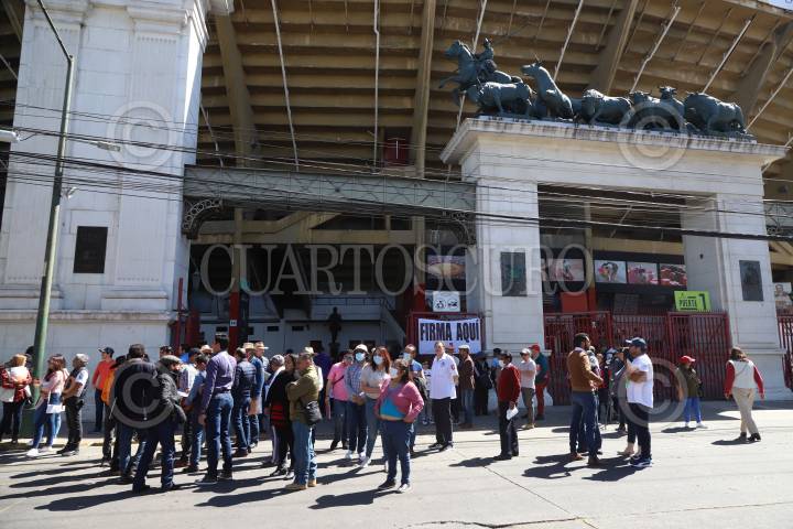 Aficionados y trabajadores de la Plaza de Toros México se reunieron a las afueras de este inmueble para recabar firmas en defensa de la llamada fiesta brava y de sus fuente de trabajo.