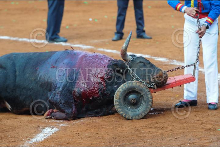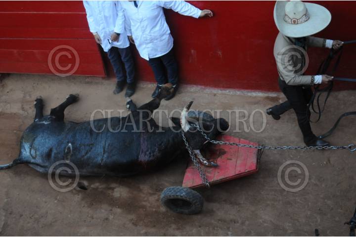 CIUDAD DE MÉXICO, 04FEBRERO2024. - Un toro es retirado de la arena sin vida luego de la primera corrida en la Plaza de Toros. FOTO: DANIEL AUGUSTO /CUARTOSCURO.COM