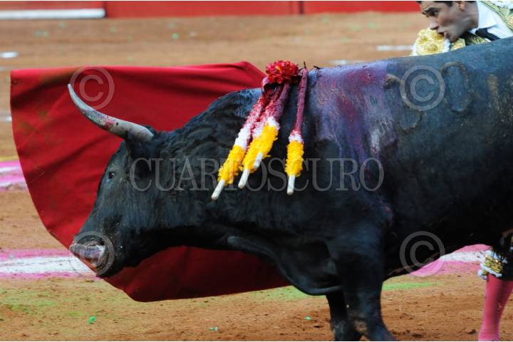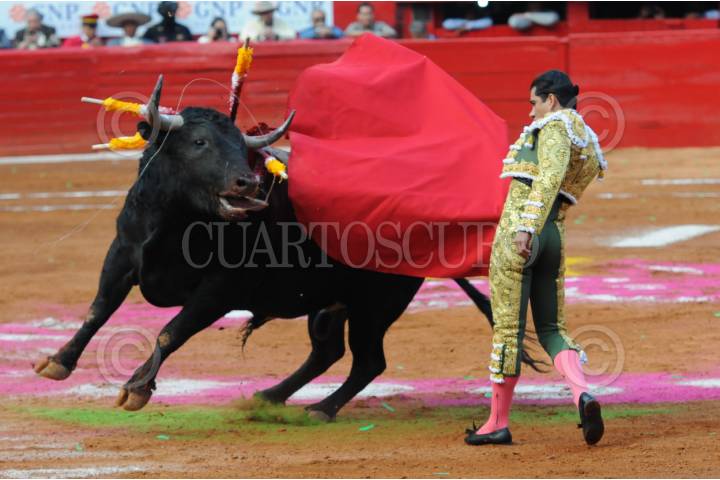 CIUDAD DE MÉXICO, 04FEBRERO2024.-Uno de los toros sale y enfrenta a su torero en la primer corrida de la tarde en la Plaza de Toros. FOTO: DANIEL AUGUSTO /CUARTOSCURO.COM