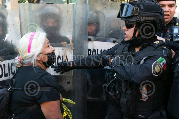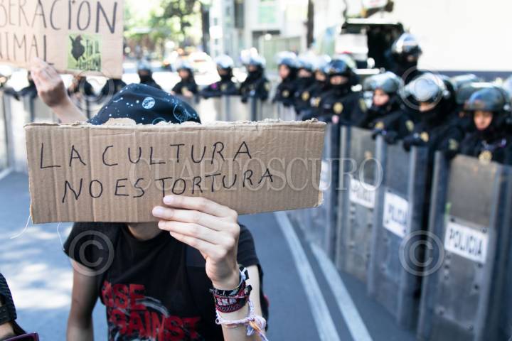 CIUDAD DE MÉXICO, 05FEBRERO2024.- Activistas antitaurinos se manifestaron en la Plaza de Toros México, en donde se llevó a cabo la corrida de aniversario, esto en el marco de las controversias jurídicas que se han suscitado en la última semana para detenerlas, las presentes exigen detener este espectáculo al que califican de maltrato animal, policías de la SSC encapsularon a los manifestantes. FOTO: MOISÉS PABLO/CUARTOSCURO.COM