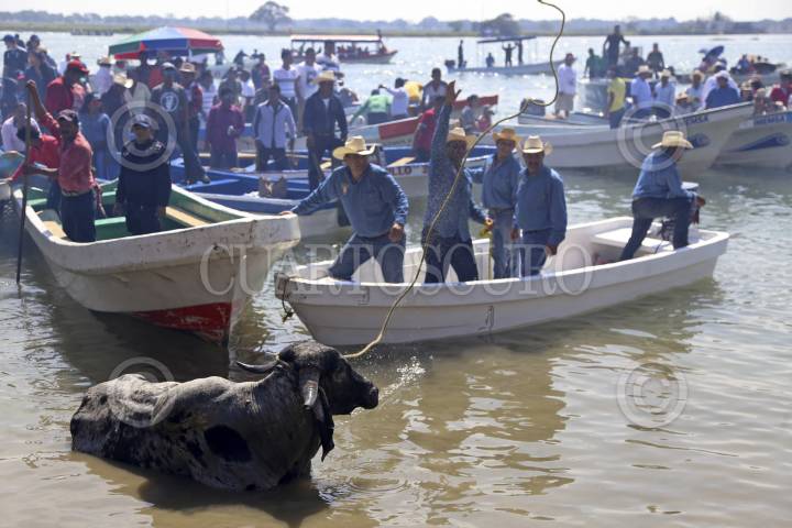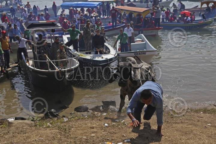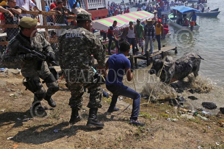TLACOTALPAN, VERACRUZ, 01FEBRERO15.- Se realiza el tradicional embalse de toros en las Fiesta de la Candelaria; 6 toros fueron liberados ante una multitud que entre alcohol y adrenalina jalaron, corretearon, golpearon e incluso mordieron a las nerviosas criaturas que solo buscaban resguardarse, a pesar de que las autoridades se mantenían al pendiente de los sucesos uno de los toros saltó la valla y durante hora y media permaneció a la orilla del río con el riesgo de ahogarse y morir, horas después lograron sacarlo. FOTO: ILSE HUESCA /CUARTOSCURO.COM