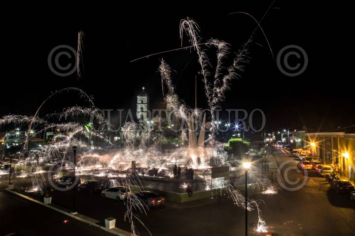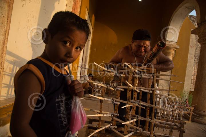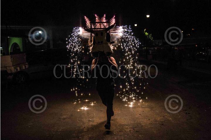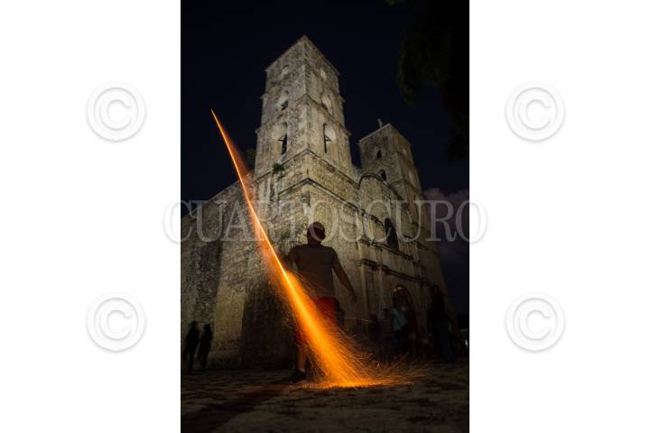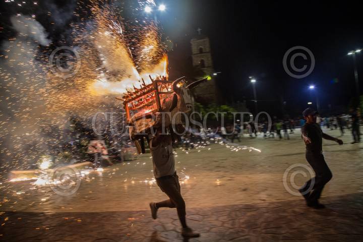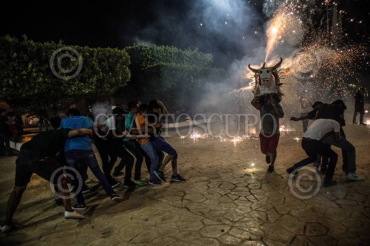 HECELCHAKÁN, CAMPECHE, 21JULIO2018.- La quema de los Toritos en este poblado es una tradición que se realiza durante el mes de julio y forma parte de los festejos del tradicional novenario en honor al Santo Cristo Señor de la Salud, patrono de la iglesia de San Francisco de Asís. Como cada año, cientos de personas acuden a la plaza principal para presenciar la quema de mas de una docena de toritos, mientras corren para resguardarse de los cohetes. FOTO: MARTÍN ZETINA /CUARTOSCURO.COM
