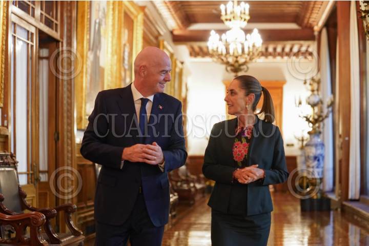CIUDAD DE MÉXICO, 28AGOSTO2025.- Claudia Sheinbaum Pardo, Presidenta de México, se reunió con Gianni Infantino, presidente de la FIFA, para hablar sobre los preparativos de la próxima Copa Mundial de Fútbol, cuyo partido inaugural se jugará en el Estadio Azteca. FOTO: PRESIDENCIA/CUARTOSCURO.COM