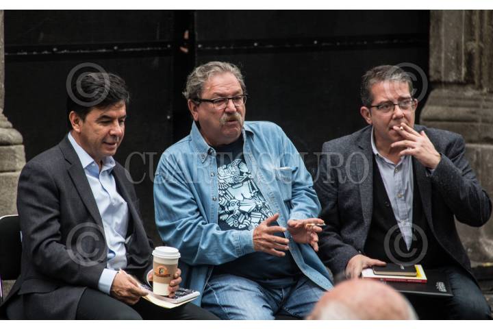 CIUDAD DE MÉXICO, 07JUNIO2019.- Jesús Ramírez, coordinador general de Comunicación Social de Presidencia; Paco Ignacio Taibo II, titular del Fondo de Cultura Económica y Genaro Villamil, presidente del sistema público de Radiodifusión, durante la develación de la placa a la memoria del Periodista Paulino Martínez en el edificio del Centro Cultural del México, esto como parte de las actividades por el día de la Libertad de Prensa celebrado el día de hoy, FOTO: ANDREA MURCIA /CUARTOSCURO.COM