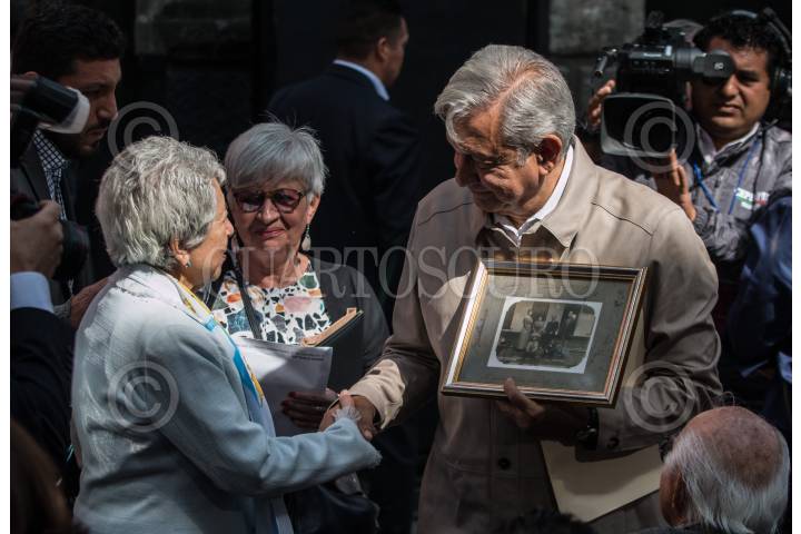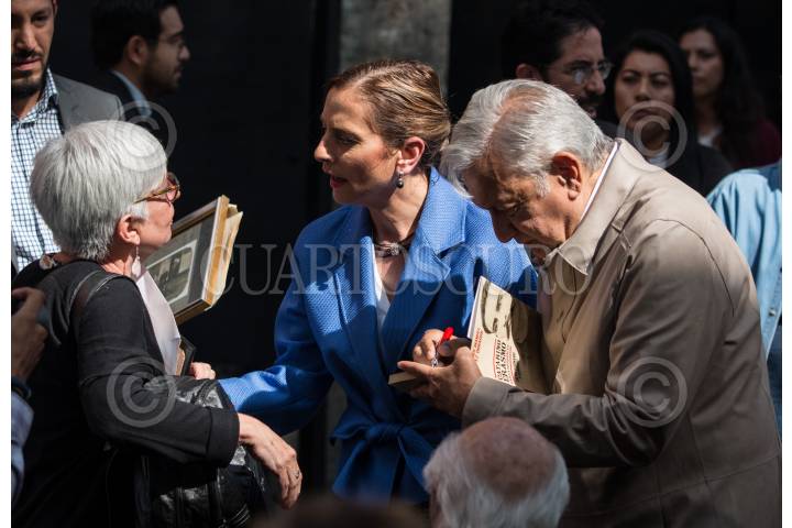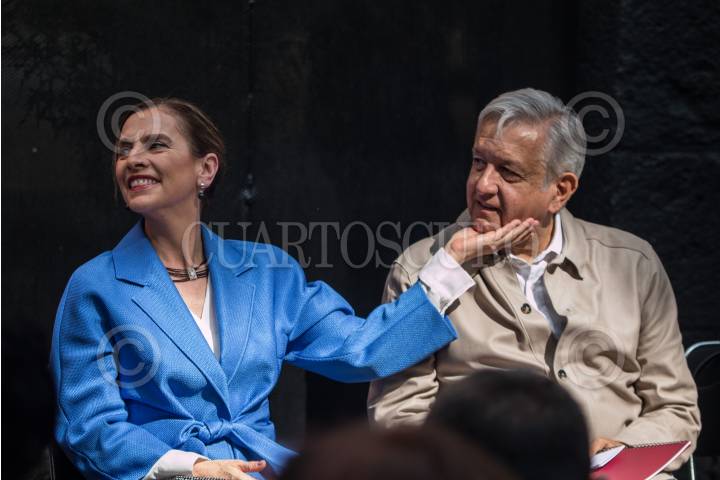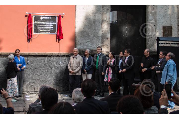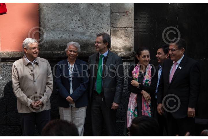 CIUDAD DE MÉXICO, 07JUNIO2019.- El presidente de la República, Andrés Manuel López Obrador; su esposa, Beatriz Gutierrez Müller; la jefa de Gobierno de la Ciudad, Claudia Sheinbaum; Olga Sánchez Cordero, secretaria de Gobernación; Esteban Moctezuma, secretario de Educación Pública; Paco Ignacio Taibo II, titular del Fondo de Cultura Económica; Genaro Villamil, presidente del sistema público de Radiodifusión y Jesús Ramírez, coordinador general de Comunicación Social de Presidencia, encabezaron la develación de la placa a la memoria del Periodista Paulino Martínez en el edificio del Centro Cultural del México, esto como parte de las actividades por el día de la Libertad de Prensa celebrado el día de hoy, FOTO: ANDREA MURCIA /CUARTOSCURO.COM