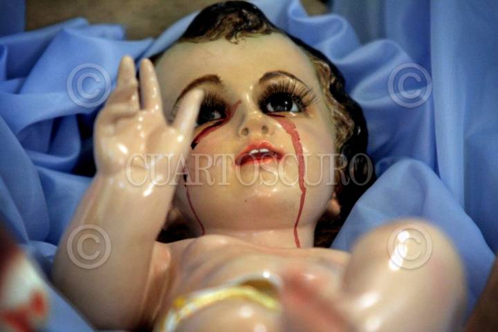 XICO, VERACRUZ., 05ENERO2011.- En la pequeña capilla de "El Llanito" de este municipio feligreses y curiosos aseguran que ocurrió un milagro después de que un par de niños de la zona descubrieron que la figura del Niño Dios tenia lágrimas de sangre real, lo que de inmediato atrajo la visita de los pobladores para venerarlo, sin embargo, el párroco optó por limpiar la imagen y negó que el hecho fuera real, afirmando que solo se trato de una prueba de fe. FOTO: FÉLIX MÁRQUEZ/CUARTOSCURO.COM