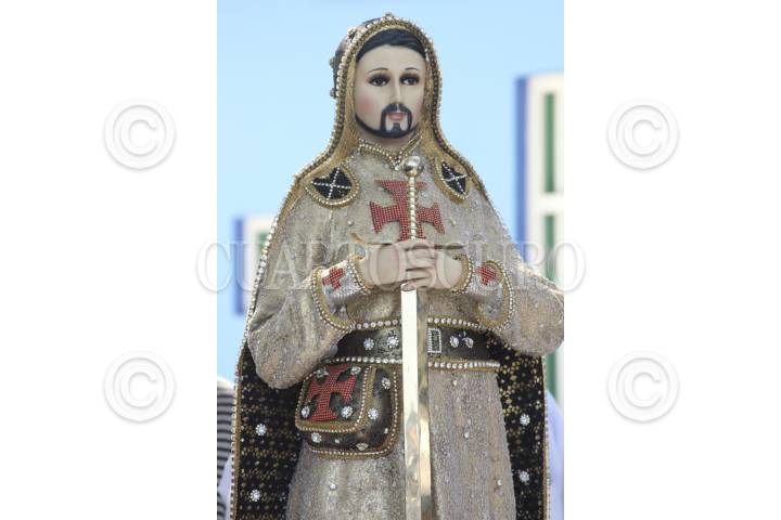 Dos hombres cargan una figura gigante de un querubín en una calle del centro de la capital.