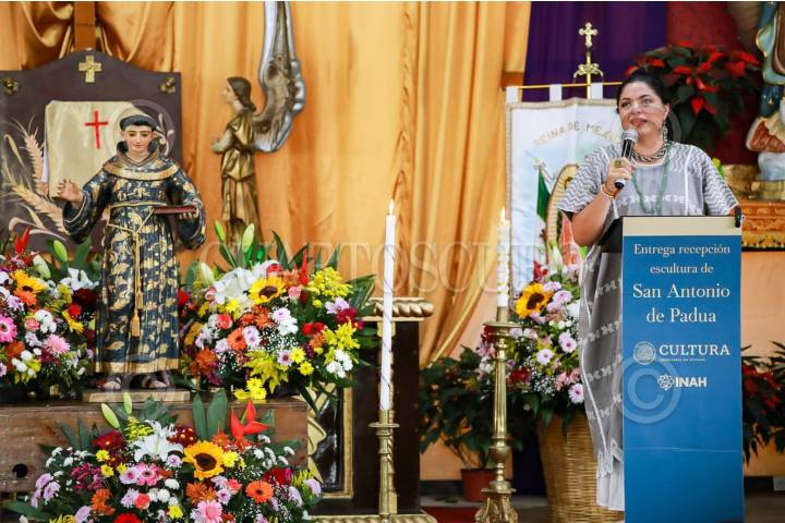 La Secretaria de Cultura federal, Alejandra Frausto, encabezó la entrega restaurada la escultura virreinal de san Antonio de Padua a la feligresía de Jiutepec.