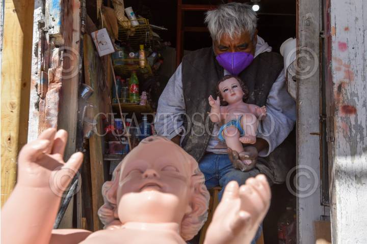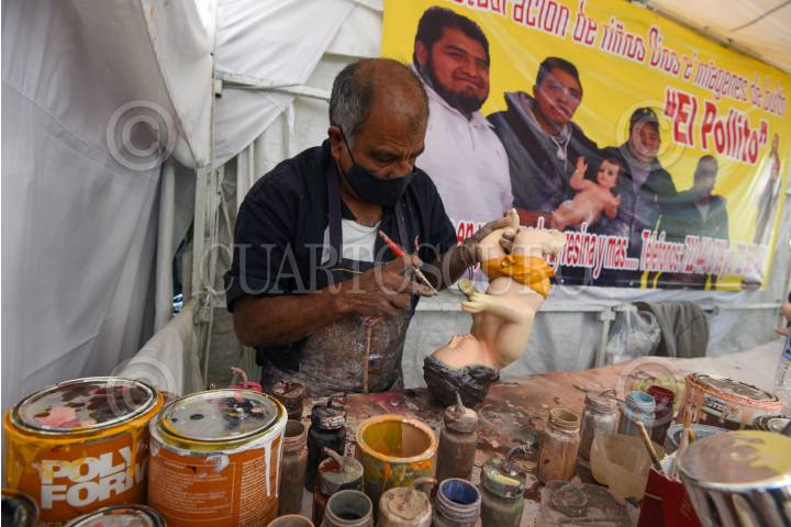 El señor Issac Cortázar conocido como “Don Chavelo” lleva más de 40 años dedicándose a la reparación de imágenes del Niño Dios, antes de iniciar la reparación sanitiza las figuras como una medida ante la contingencia por COVID-19.