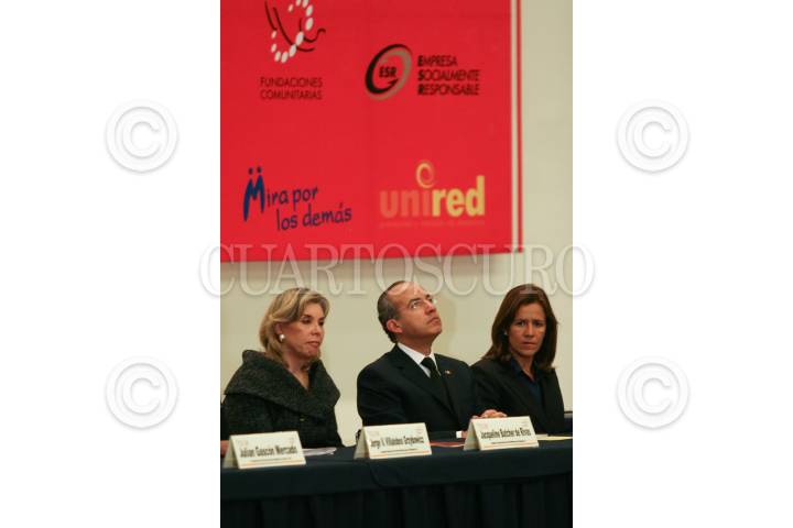 MÉXICO D.F., 10NOVIEMBRE2008.- El presidente, Felipe Calderón Hinojosa, acompañado de su esposa Margarita Zavala, acudió esta mañana a la inauguración de los trabajos del Centro Mexicano de la Filantropía (CEMEFI) esto dentro del marco de la conmemoración del 20 aniversario de su fundación. En la imagen son acompañdos por Jaquelin Butcher. FOTO: GUILLERMO PEREA/CUARTOSCURO.COM