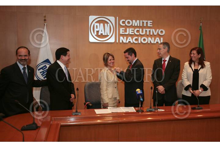 MÉXICO, D.F., 28SEPTIEMBRE2010.- Minerva Hernández, ex-candidata a la gubernatura de Tlaxacala por el PRD recibió su filiación a el PAN, este le fue entregado por Alfredo Rivadeneyra, secretario general del PAN. Los acompañan loss senadores Gustavo Madero, Ricardo Olivares, José González Morfín y Judith Díaz. FOTO: ESPECIAL/CUARTOSCURO.COM