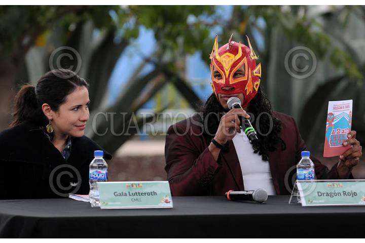 CIUDAD DE MÉXICO, 20NOVIEMBRE2016.- En el Cuentódromo Narnia de la 36 FILIJ en el Parque Bicentenario, se presentó el libro "A 2 de 3 cuartillas. Selección de cuentos", del Consejo Mundial de Lucha Libre (CMLL) y la Secretaría de Cultura. En la foto, Gala Lutteroth, Dragón Rojo y José Carmen Díaz. FOTO: SECRETARÍA DE CULTURA/ CUARTOSCURO.COM