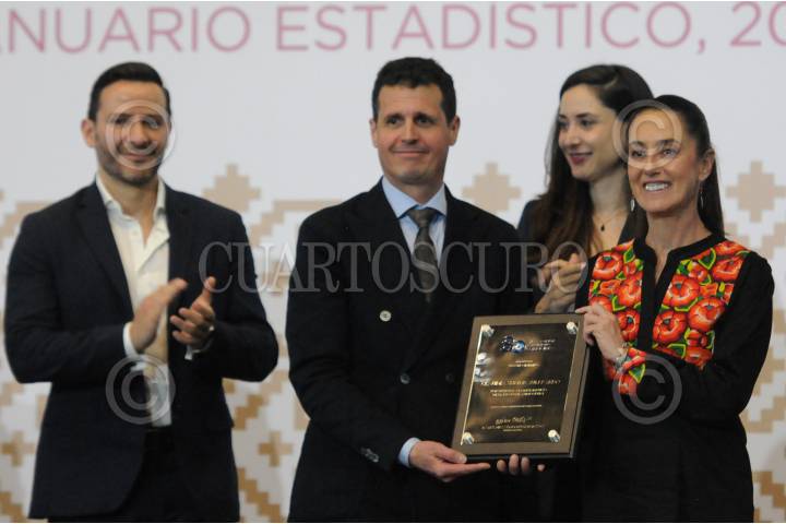 Claudia Sheinbaum, jefa de gobierno, recibe un reconocimiento de parte del titular de la Canacine, Avelino Rodríguez.