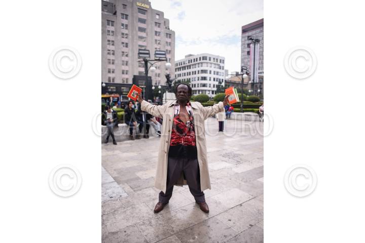 CIUDAD DE MÉXICO, 25DICIEMBRE2018.- Joaquín, quien goza de deambular por las inmediaciones del Palacio de Bellas Artes ofreciendo a los viandantes la sabiduría que guardan los filósofos griegos de la antiguedad, posa con algunos de sus libros mientras canta "Soy más fuerte que Poseidón". FOTO: PEDRO ANZA /CUARTOSCURO.COM