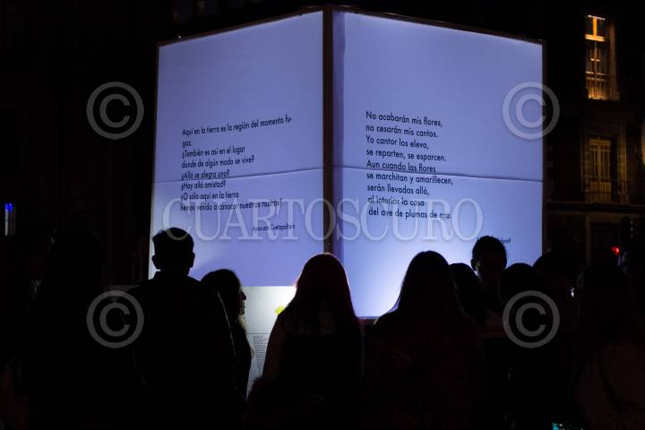 CIUDAD DE MÉXICO, 19NOVIEMBRE2017.- A través de las diferentes instalaciones del Festival Internacional de las luces 2017 (filux) es como se homenaje a las víctimas de los sismos del 7 y 19 de septiembre pasado. En la plaza de Santo domingo, un cubo con un poema de Ayocuan Cuetpaltzin llama a los visitantes a acercarse a una placa con el número de cuenta del Fondo de Desastres Naturales (Fonden) para seguir donando. FOTO: GALO CAÑAS /CUARTOSCURO.COM