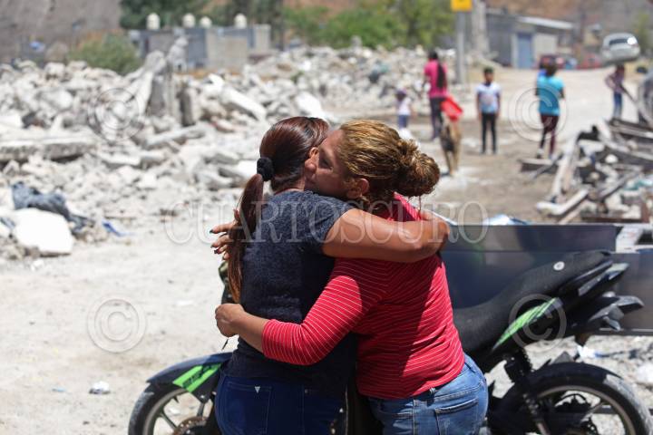 Dos mujeres que fueron desalojadas el día de ayer de sus hogares se abrazan, esto después del desalojo de habitantes de la colonia Miramar por encontrarse en zona de riesgo tras acercarse el temporal de lluvias.