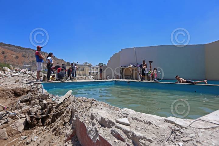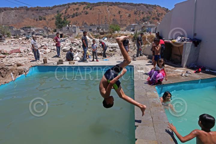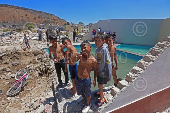Niños de la colonia Miramar en Zapopan, se divierten en una alberca de una finca demolida que se encontraba en riesgo, esto después de haber sido desalojados por encontrarse en zona de riesgo tras acercarse el temporal de lluvias.