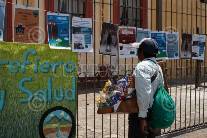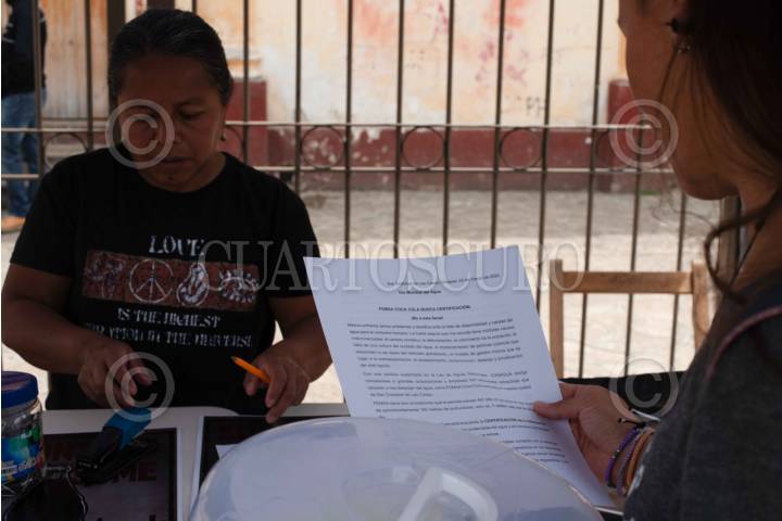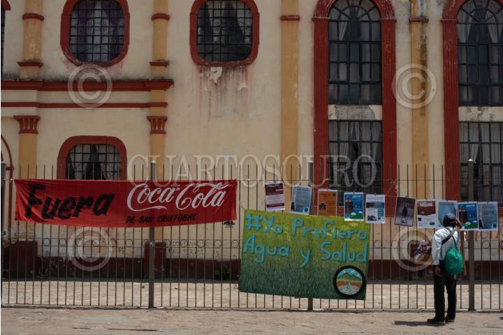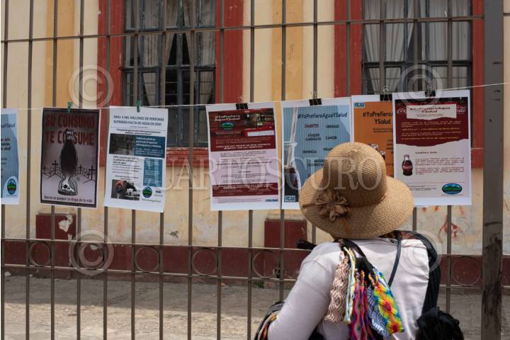 SAN CRISTÓBAL DE LAS CASAS, CHIAPAS, 15MARZO2024.- Sociedad Civil organizada impulsa campaña contra FEMSA Coca Cola quienes están buscando la certificación de la Alliance for Water Stewardship (AWS), por la gestión sustentable del agua y por emplear estrategias y acciones para devolver a la cuenca el agua que extrae. Durante la recabación de firmas se ofrecieron volantes con información de cómo la empresa extrae millones de litros de agua del subsuelo del territorio local y a su vez contamina, no solo la región si no el organismo de millones de personas, siendo Chiapas el territorio que ocupa el primer lugar en el mundo en consumo de Coca-Cola. FOTO: ISABEL MATEOS /CUARTOSCURO.COM