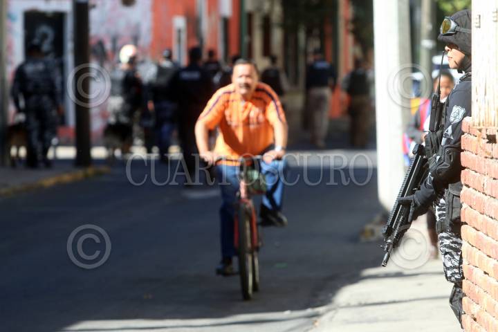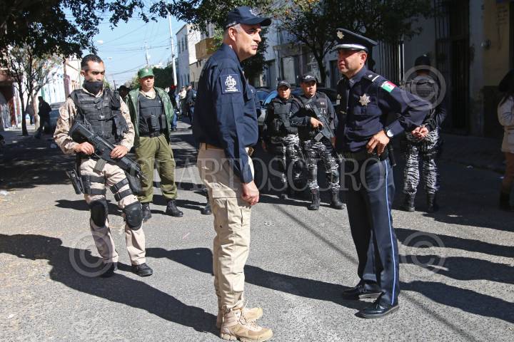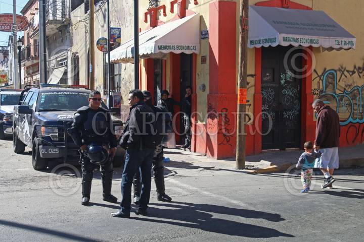 GUADALAJARA, JALISCO. 08ENERO2016.- Elementos de la Policía de Guadalajara con apoyo de la Fiscalía del Estado, la Policía Federal y personal de inspección y vigilancia, realizaron un operativo en la zona del Santuario para inhibir la venta de medicamentos sin permiso en el punto. Salvador Caro, titular de la corporación municipal, señaló que el operativo forma parte de la estrategia de reordenamiento del Centro Histórico. FOTO : FERNANDO CARRANZA GARCIA / CUARTOSCURO.COM