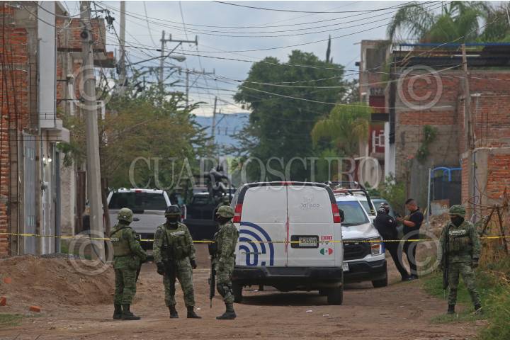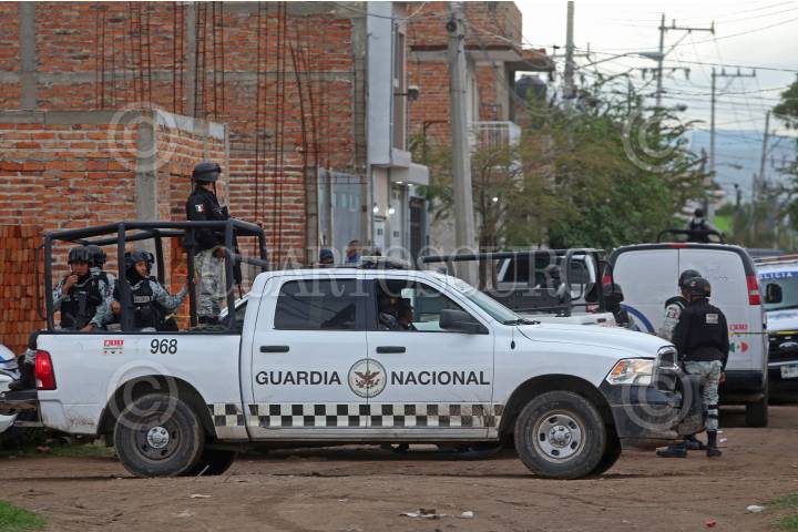 Personal de la Guardia Nacional, resguarda la zona donde la noche de ayer se registro un enfrentamiento entre civiles armados y policías del municipio así como del estado, el cual dejo como saldo 12 personas fallecidas, en el municipio del Salto, Jalisco.